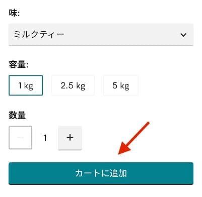 気になる商品のページから味、容量、数量など選んで「カートに追加」をタップするだけ。