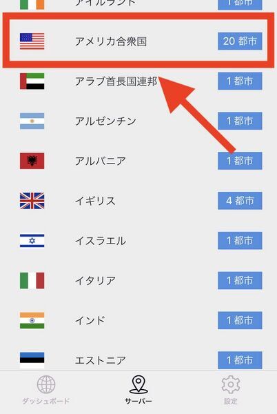 画面下部にある「サーバー」をタップし、アメリカ合衆国を選択して下さい。